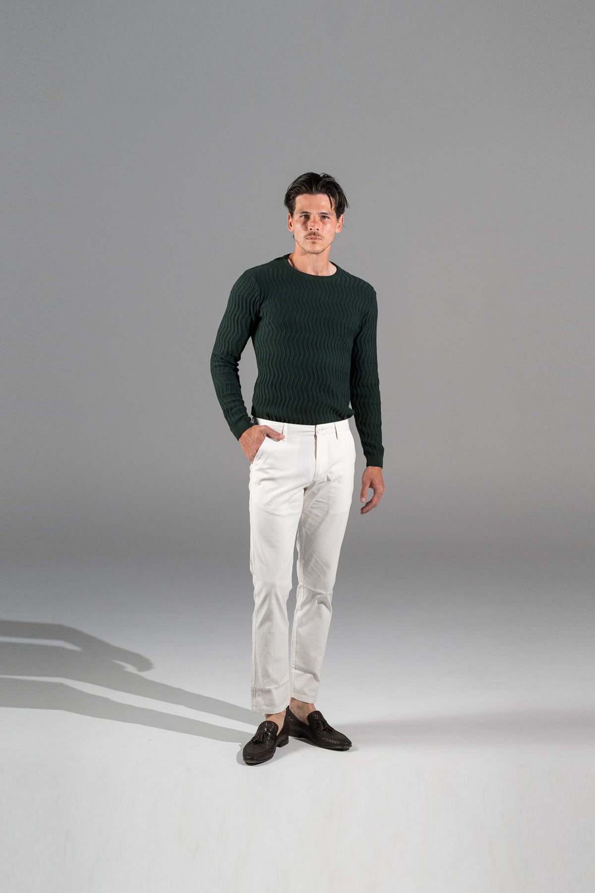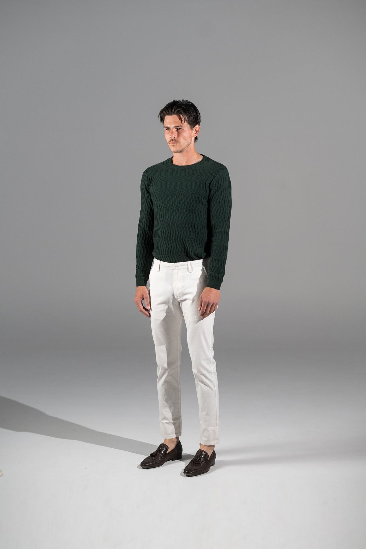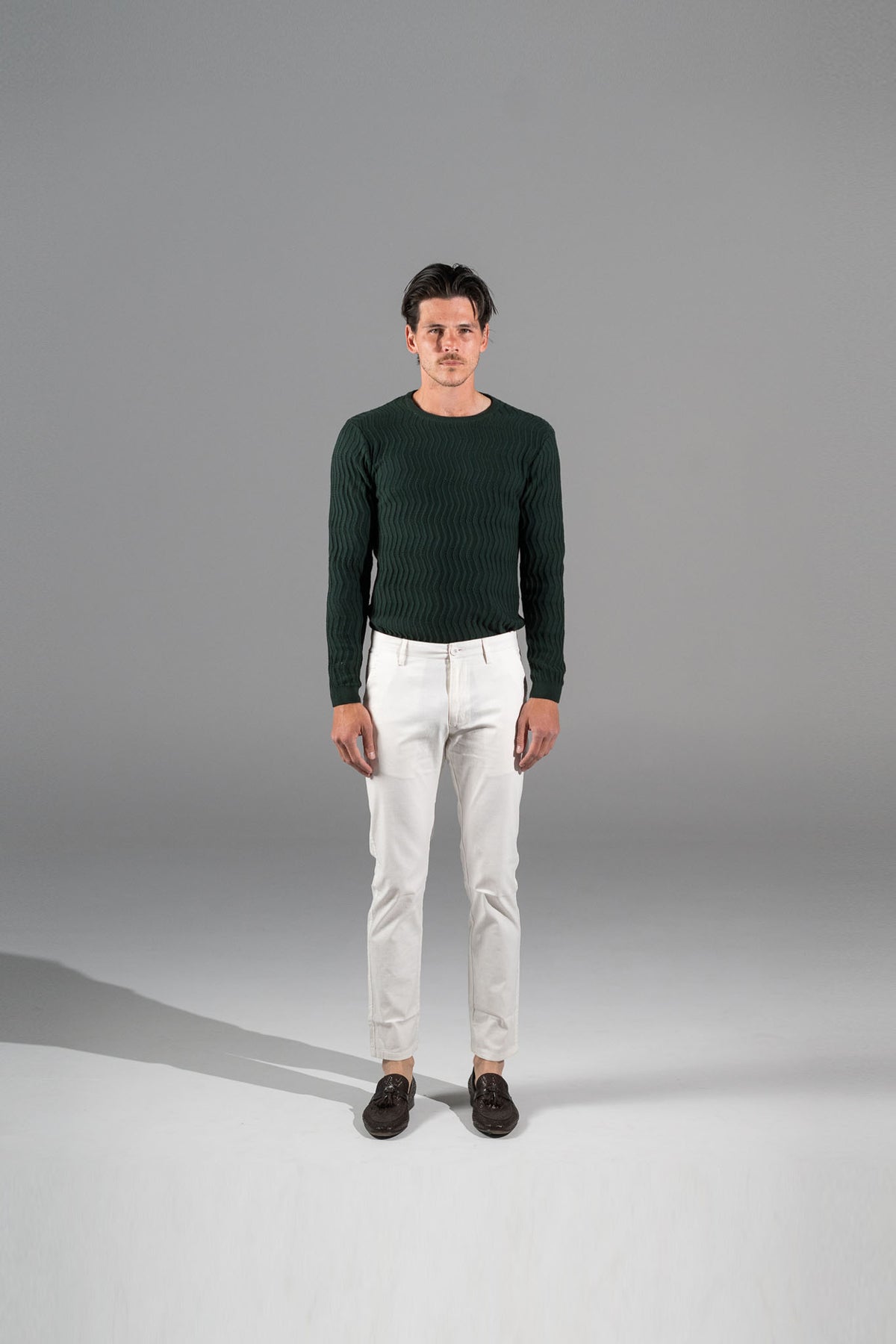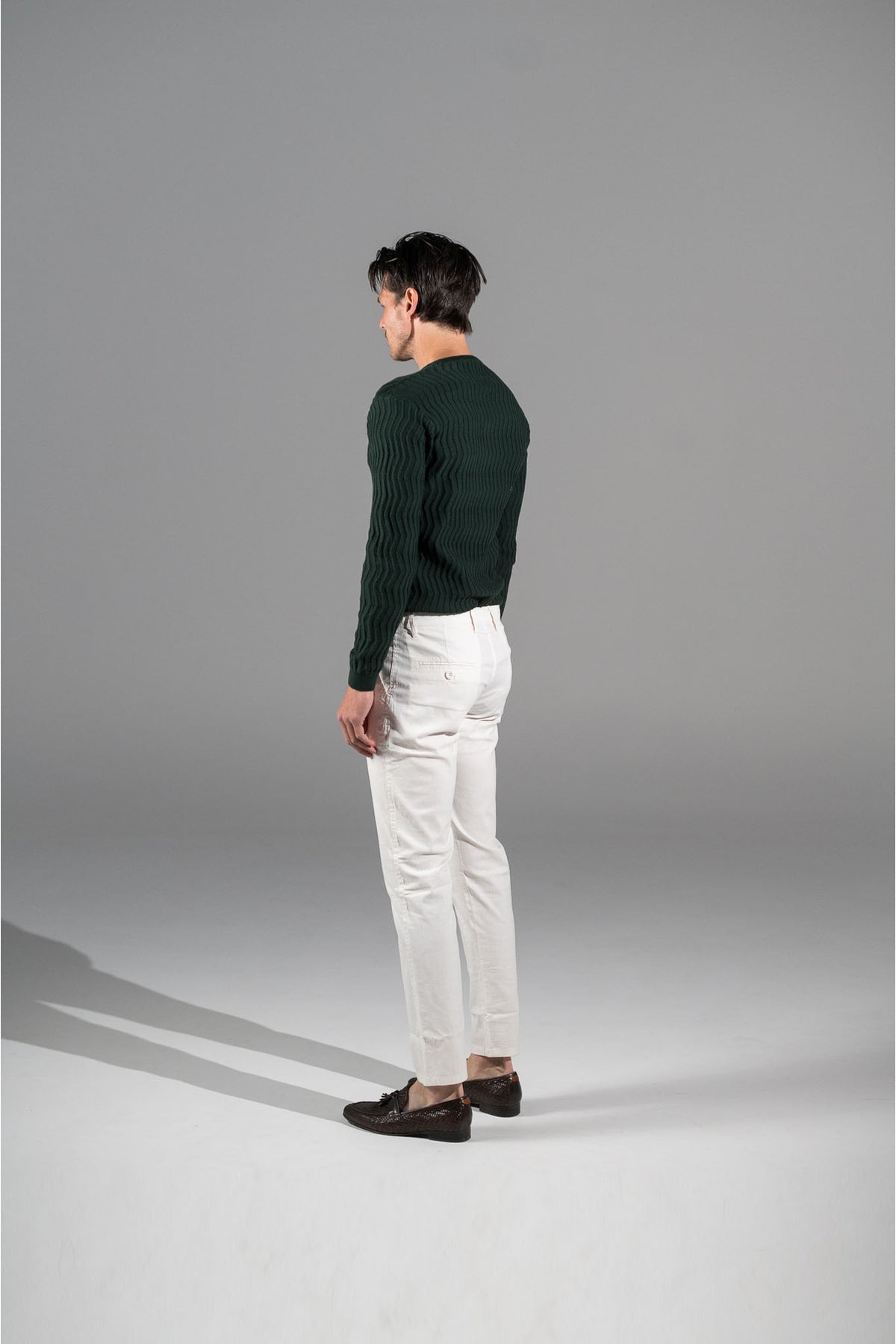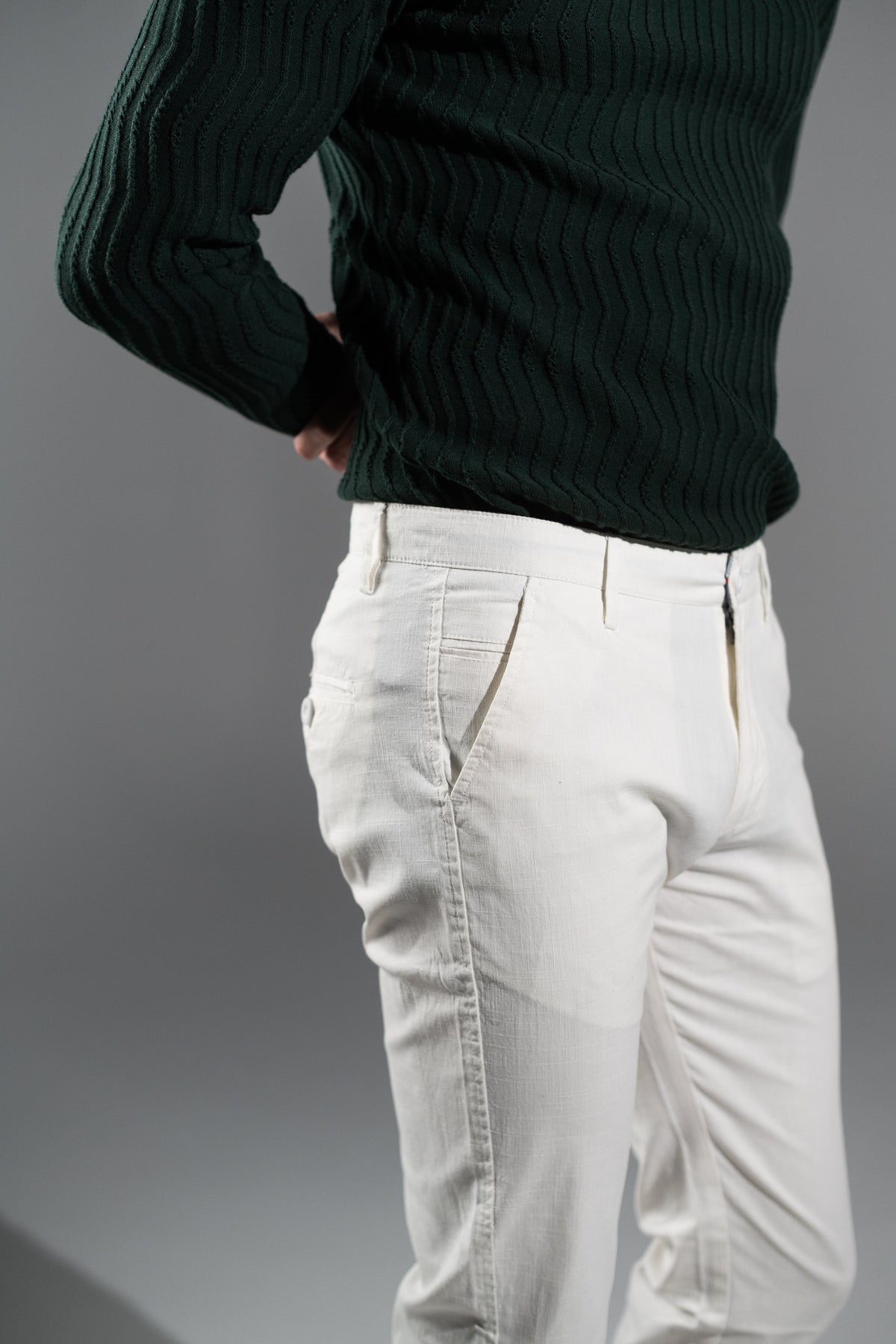 Crafted from a 98% cotton, 2% elastane blend, these pants offer the perfect balance of softness, structure, and stretch. The breathable fabric keeps you comfortable all day, while the textured pattern adds a subtle touch of style for a timeless, versatile look.